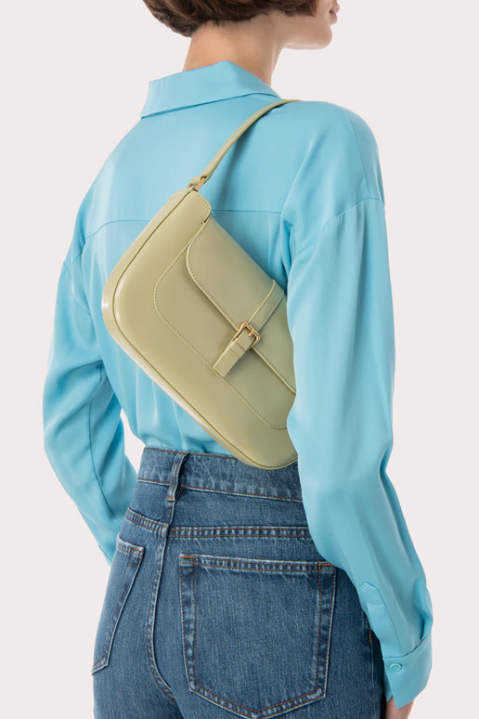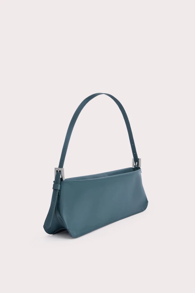 BY FAR的Dulce单肩包拥有细长的长方形轮廓,采用小牛皮制作,带半漆皮的质感,配有可调节的皮革肩带和拉链。有多种颜色可选:孔雀蓝、米色、黑色等,也有粒纹皮革材质的款式可选。