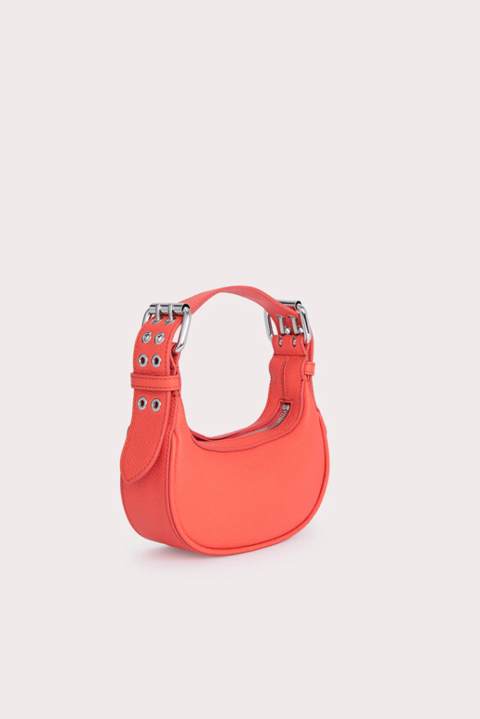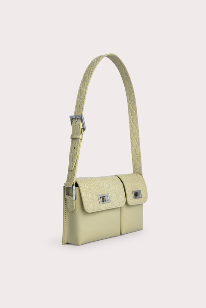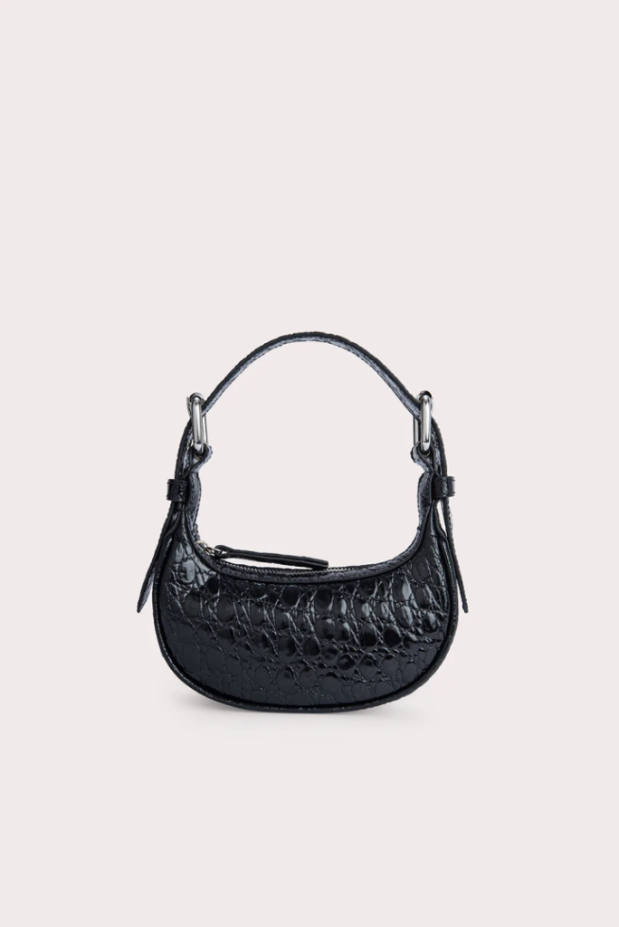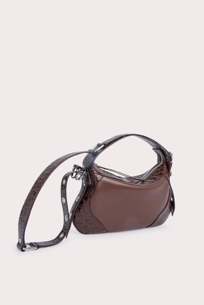 这款Mini Soho手袋采用BY FAR标志性的鳄鱼压纹牛皮革制成。顶部提手款式具有独特的弧形轮廓,可调节提手上的超大双扣和多个孔眼细节增强了整体包款设计的街头风格。有多种颜色可选:蓝色、米色、黑色、棕色、粉色等,也有粒纹皮革材质和漆皮面料的款式可选。