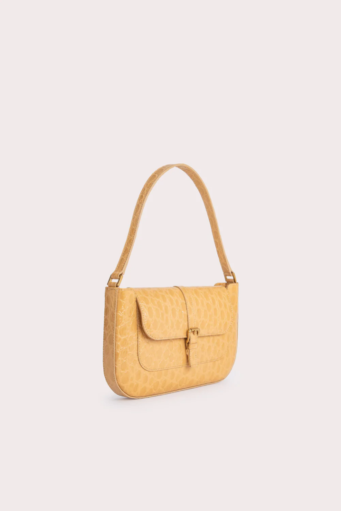 Miranda单肩包是对经典长方单肩包款式的升级,采用小牛皮制结构化设计,配有磁性翻盖和拉丝金色五金配件,采用半漆皮制成。有多种颜色可选,除了漆皮款式外,也有鳄鱼压纹皮革可选。
